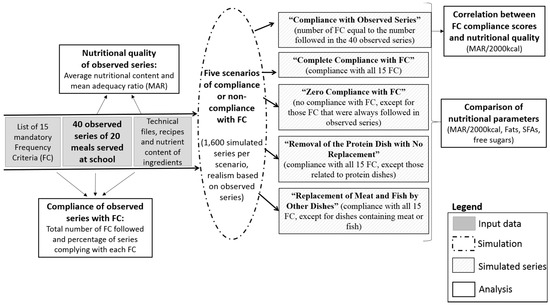 In the fifth and last scenario—“Replacement of Meat and Fish by Other Dishes”—series of meals were generated by randomly replacing the protein dishes and starters containing meat or fish in the “Complete Compliance with FC” series (generated in the second scenario) with protein dishes and starters that did not contain meat or fish. It should be noted that dishes “without meat or fish” are defined as “vegetarian” under the GEM-RCN’s Nutrition Recommendations [13]. In order to have sufficient diversity in the simulated series for this scenario, 32 dishes served as protein dishes without meat or fish and not included in the dishes present in the 40 series of 20 meals were specifically collected from the partners. These additional technical files corresponded to dishes actually served in schools as alternatives to meat or fish dishes.