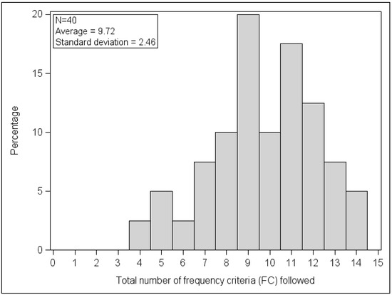 On average, 9.7 out of the 15 FC were fulfilled in the sample of 40 observed series, with a minimum of 4 and a maximum of 14 (Figure 2).