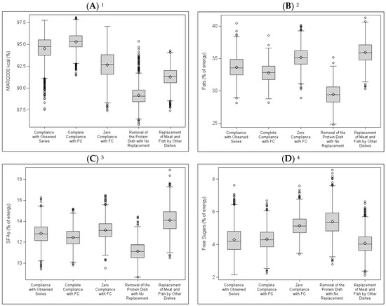 Nutritional quality of simulated series according to five scenarios: Box Plots (A) Mean Adequacy Ratio (MAR, % of adequacy for 2000 kcal); (B) Fats (% of energy); (C) Saturated Fatty Acids (SFAs, in % of energy); (D) Free Sugars (% of energy). 1 For MAR/2000 kcal, the averages are statistically different (p < 0.05) from one series to another. 2 For fats (% of energy), the averages are statistically different (p < 0.05) from one series to another, except between “Zero Compliance with FC” and “Replacement of Meat and Fish with Other Dishes”. 3 For SFAs (% of energy), the averages are statistically different from one series to another (p < 0.05). 4 For free sugars (% of energy), the averages are statistically different (p < 0.05) from one series to another except between “Complete Compliance with FC” and “Compliance with Observed Series”, and between “Complete Compliance with FC” and “Replacement of Meat and Fish with Other Dishes”.