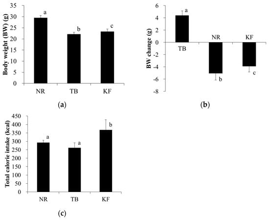 Weight and weight change at day 21 were both significantly lower in the TB group than in the NR group (Figure 1a,b). Although weight and weight change were also both significantly lower in the KF group than in the NR group, they were significantly higher compared to that in the TB group (Figure 1a,b). Total energy intake during the experimental period was significantly higher in the KF group than in the other two groups (Figure 1c).