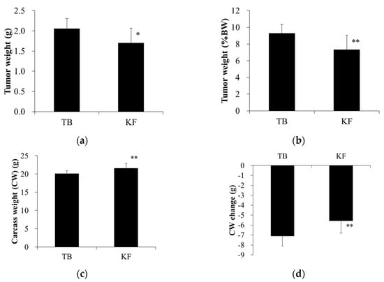 Tumor weight was significantly lower in the KF group than in the TB group (Figure 2a,b). Similar to body weight, carcass weight and change in carcass weight were both significantly greater in the KF group than the TB group (Figure 2c,d).