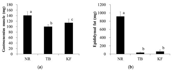 In addition, gastrocnemius muscle mass was also significantly lower in the TB group than in the NR group; however, in the KF group it was significantly higher than that in the TB group (Figure 3a). Epididymal fat mass was significantly lower in both the TB and KF groups than in the NR group, with no significant difference between the KF and TB groups (Figure 3b).
