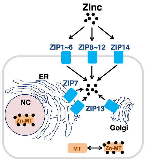Zinc transporters and metallothionein (MT) are involved in intracellular zinc homeostasis. NC; nucleus, ER; endoplasmic reticulum, Zn; zinc.