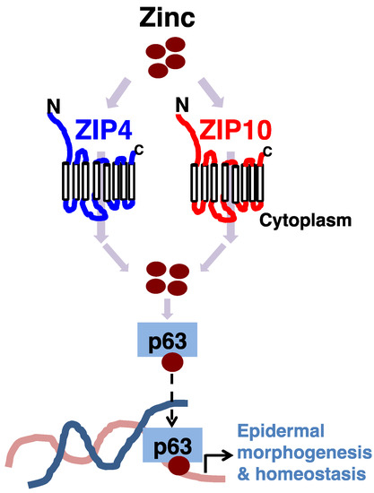 Zinc transporters known for their role in the epidermis are ZIP4 and ZIP10. ZIP4 is actively expressed in human but not in mouse skin [33,71]. Recent skin equivalent experiments with human keratinocytes demonstrated the importance of ZIP4 in epidermis formation [56]. When ZIP4 is knocked-down by siRNA, epidermal hypoplasia occurs, accompanied by decreased activity of p63, an master regulator with a zinc binding site that promotes the proliferation and differentiation of epidermal progenitor cells in epithelium formation (Figure 2) [56,72,73]. When zinc is deficient, nuclear translocation of p63 is disturbed, followed by abnormal epidermal formation (Figure 2) [56]. Detailed analysis revealed that the 205th Cys among the four Cys residues in the zinc binding site plays an important role in post-modification of p63, suggesting that zinc deficiency affects the DNA binding affinity of p63 involved in signal transduction. Since Zn affects the structure and functions of many proteins [17], ZIP4 may not only target the p63, but also influence the structure and activity of other zinc binding enzymes for epidermal growth. With regard to this issue, further studies are needed to clarify the relationship between ZIP4 and AE. Interestingly, it was recently found that natural products such as soybean extracts increase the expression of ZIP4 [74]. Therefore, this can be a starting point for controlling the rate of zinc absorption.