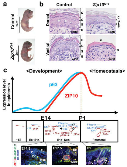ZIP10 reinforces p63 function for epidermis development. (a) ZIP10 deficiency leads to epidermal hypoplasia in mice. (b) Hematoxylin and eosin staining revealed dorsal epidermal hypoplasia and ventral embryonic epidermis (asterisk) in P1 Zip10K14 mice. C, cornified layer; G, granular layer; S, spinous layer; B, basal layer. (c) Model for ZIP10’s involvement in p63 function during epidermis development. ZIP10, whose expression is elevated from E14, contributes to the activities of increased p63 by supplying zinc. This allows p63 to properly bind to DNA for initiating gene expression for epidermis development, including cell proliferation and stratification. DC, dermal condensate; Epi, epithelium; Mes, mesenchyme; P, placode (Scale bar, 100 μm). Red (E17.5) and arrows (P2) indicate the ZIP10 protein expression. Modified from Bin et al. [36].