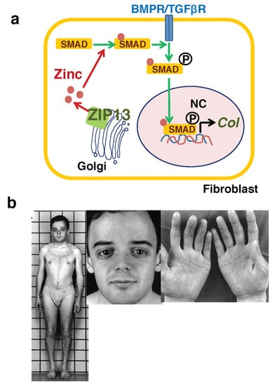 Zinc transporters known to be important in the dermis are ZIP 7 and ZIP 13 [37,38]. Both ZIP7 and ZIP13 are present in skin cells and are mainly located in the ER and Golgi, respectively [19,37,38]. These two zinc transporters are closest to each other when a phylogenetic tree of ZIP family members is constructed. ZIP13 is also close to the zinc transporter of insects/bacteria [19]. ZIP13 is the smallest of the mammalian zinc transporters classified in the LIV-1 family, and thus has a shorter N-terminus and intracellular domain 2 than other transporters. The most abundant amino acid in ZIP7 is histidine, which is a characteristic of the LIV-1 family whose role is unknown; this is also the case for the methionine-rich motif that is largely conserved in copper transporters for copper binding and storage [19,75]. During functional analysis of zinc carriers, the first association of the zinc transporter with skin was found in Zip13-knockout mice [38]. The Zip13-knockout mice showed impaired collagen production with abnormal morphology of collagen-producing cells and shrunken cartilage with defective chondrocyte differentiation. The number of collagen fibers in Zip13-knockout mice was remarkably reduced as visualized under an electron microscope, and skin cracking and swelling phenomena were also remarkable because of severely decreased skin strength. This abnormal collagen production was reflected in the mouse face features with an enophthalmos-like appearance, eye blindness, and down-slanting palpebral fissures. The fibroblasts isolated from Zip13-knockout mice exhibited dysfunction in the BMP/TGF-β signaling pathway, which is essential for collagen formation. In Zip13-knockout mice, the nuclear translocation of SMAD transcription factors in the BMP/TGF-β signaling pathway was impaired, while remaining intact in terms of their phosphorylation status (Figure 4a). Examination of the zinc distribution in Zip13-deficient fibroblasts with an electron probe X-ray micro analyzer revealed that the nuclear zinc content was reduced, while that in the Golgi was increased [38,76].