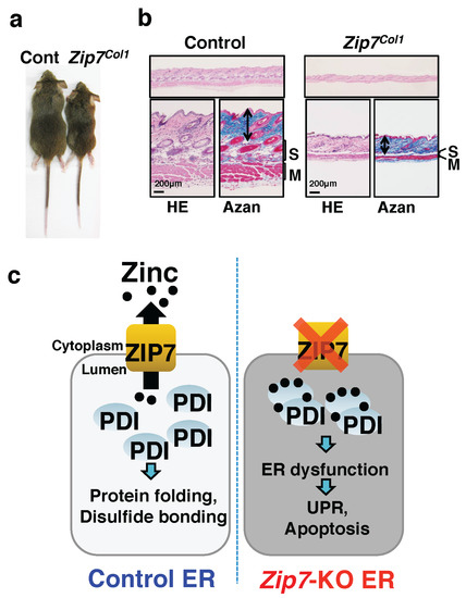 ZIP7 is essential for dermis formation. (a) Five-week-old female wild-type (WT) and Zip7Col1 mice. (b) The thickness of the Azan-stained Zip7Col1 dermis is reduced. M, muscle; S, Subcutis. (c) Models for the involvement of ZIP7 in ER function. When ZIP7 is dysregulated (right), the luminal zinc level is elevated, which would induce zinc-dependent aggregation of PDIs. Therefore, protein folding and disulfide bond formation would proceed aberrantly, leading to unfolded protein responses. ER, endoplasmic reticulum; KO, knockout; PDI, protein disulfide isomerase; UPR, unfolded protein response. Modified from Bin et al. [37].