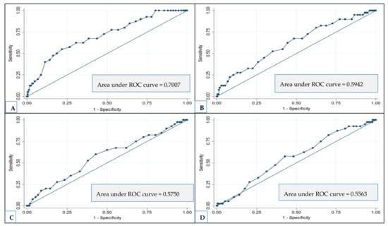 The ability (ROC curve) of each dietary index to correctly predict MMSE decline to ≤24 over 6 years. (A) Nordic Prudent Dietary Pattern index; (B) MIND index; (C) Mediterranean Diet index; (D) Baltic Sea Diet index.