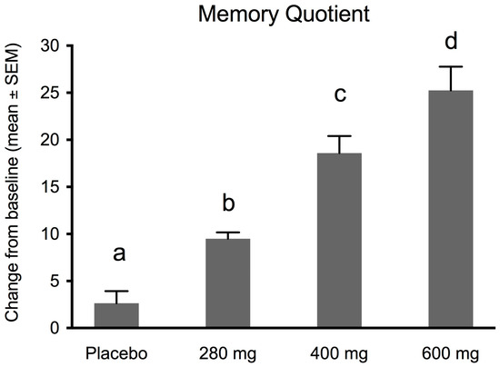 Changes in memory quotient (MQ) before and after silk fibroin protein enzymatic hydrolysate (FPEH) intake at daily doses of 0, 280, 400 and 600 mg for 3 weeks. Each value is the mean with the standard error of the mean (SEM). Groups with a different alphabetical letter are statistically significantly different on the basis of group tests following ANOVA (F = 32.97; dftotal = 62; p < 0.00013). Between group p values were the following: placebo: 280 mg, p < 0.00015; placebo: 400 mg, p < 0.0001; placebo: 600 mg, p < 0.0001; 280 mg: 400 mg, p < 0.0001; 280 mg: 600 mg, p < 0.0001; 480 mg: 600 mg, p < 0.0378.