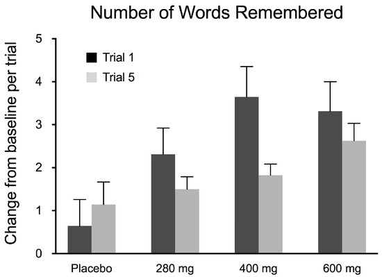 Trial 5 (gray bars) of the Rey–Kim Memory Test showed that as the daily silk FPEH intake amount increased, the number of words remembered significantly increased (ANOVA: F = 2.8258; dftotal = 62; p = 0.0463; Figure 3). The ω2 effect size was 0.081, below a small value (0.10) for ANOVA-derived effect sizes. The 600 mg daily treatment group exhibited the highest number of words remembered. The increase in the number of words remembered for Trial 5 was statistically significant as compared to the placebo control group only for the 600 mg FPEH treatment group (p = 0.0314). The difference between the 280 and 600 mg FPEH treatment groups was also statistically significant (p = 0.0316).