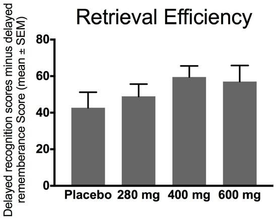 Retrieval efficiency measures how well the remembered information from the Rey Auditory Verbal Learning Test (RAVLT) could be applied to other information, with a higher percentage indicating a greater ability to accurately retrieve the memory needed. As compared to the placebo group, the FPEH treatment group subjects showed a dose-dependent improvement in retrieval efficiency of up to 400 mg, but the increases were not statistically significant (ANOVA: F = 1.0080; dftotal = 62; p = 0.3959; Figure 5). The ω2 effect size was 0.0004, a negligible value for ANOVA-derived effect sizes.