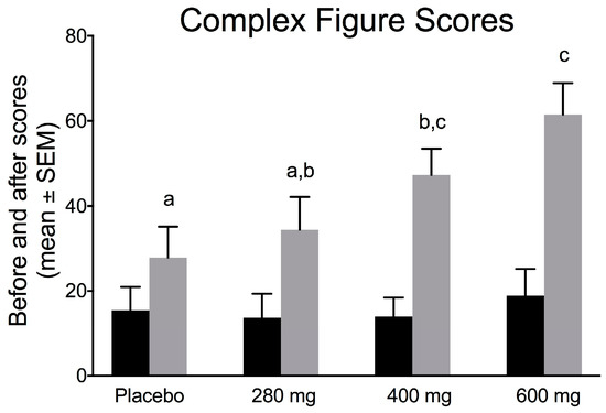 The results for the KCFT, which represents short-term memory and integrated executive functions, are presented in Figure 6. Baseline scores for each group did not differ. A significant increase in complex figure scores was found by ANOVA analysis (F = 4.2073; dftotal = 62; p =0.0092). The ω2 effect size was 0.132, a small–medium value (0.10–0.25) for ANOVA-derived effect sizes. The change in drawing/recall in the 280 mg FPEH treatment group, as compared to the placebo group, was not statistically significant (p = 0.5493). However, the 400 mg (p = 0.0497) and 600 mg (p = 0.0032) FPEH treatment groups exhibited statistically significant increases in KCFT scores from the placebo group. The 400 and 600 mg scores were not significantly different (p = 0.1492).