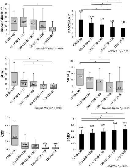 Figure 1. Correlation between the Geriatric Nutritional Risk Index (GNRI) and rheumatoid arthritis (RA) disease activity and bone mineral density (BMD). Patients were divided into 5 groups: (1) GNRI < 95 (n = 7); (2) GNRI ≥ 95 but < 100 (n = 21); (3) GNRI ≥ 100 but < 105 (n = 42); (4) GNRI ≥ 105 but < 110 (n = 56); (5) GNRI ≥ 110 (n = 20). The Kolmogorov–Smirnov test was used to evaluate the distribution of the data. The data were then examined using analysis of variance or the Kruskal–Wallis analysis. Disease duration, Disease Activity Score-28-C-reactive protein (DAS28-CRP), Simplified Disease Activity Index (SDAI), Modified Health Assessment Questionnaire (MHAQ) and bone mineral density (BMD) showed statistically significant differences between groups (p < 0.05). AVONA: Analysis of variance.