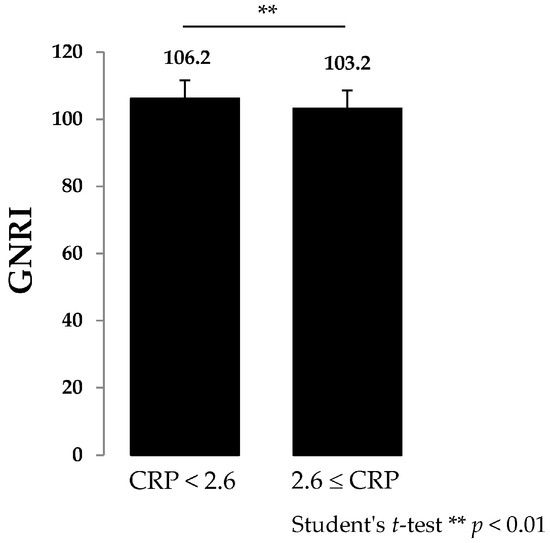 Figure 2. Difference in GNRI between the CRP < 2.6 and ≥ 2.6 groups. Kolmogorov–Smirnov test showed that data were in normal distribution. Student’s t-test showed a statistically significant difference between the two groups (p < 0.05).