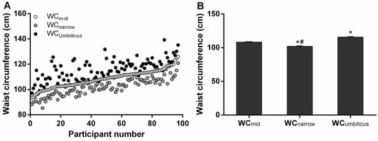 Waist circumference (WC) measurement at different sites. WC at the midpoint (WCmid), narrowest point (WCnarrow) and umbilicus (WCumbilicus) for each individual participant (A); and as means ± SEM (B), in postmenopausal women with obesity (n = 97). * p < 0.05 versus WCmid, # p < 0.05 versus WCumbilicus.