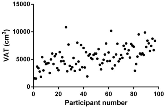 Visceral adipose tissue volume (VAT), as determined by magnetic resonance imaging for each of the postmenopausal women with obesity in this study (n = 97).