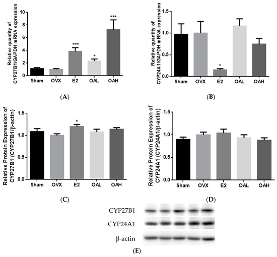 The regulatory effects of OA on renal vitamin D metabolic enzymes were then investigated. E2 and OA significantly induced renal CYP27B1 mRNA expression in OVX mice (p < 0.001 vs. OVX, Figure 2A). However, E2, but not OA, significantly stimulated renal CYP27B1 protein expression (p < 0.05 vs. OVX, Figure 2C,E) and suppressed renal CYP24A1 mRNA expression (p < 0.05 vs. OVX, Figure 2B). OA at a high dose tended to decrease renal CYP24A1 mRNA and protein expressions but the changes did not reach statistical significance (Figure 2B,D,E).