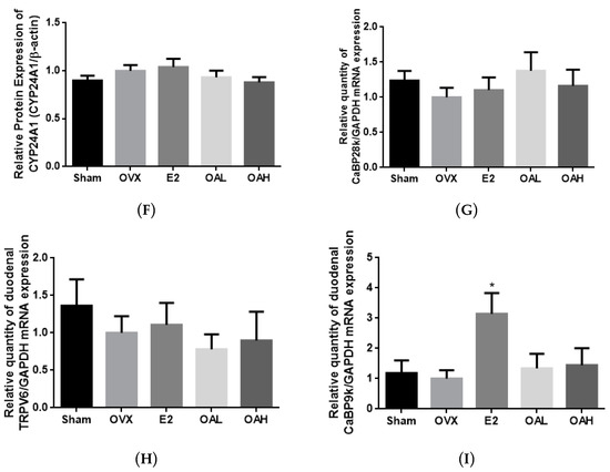 The effects of OA on renal and duodenal mRNA and protein expressions in OVX mice. The expression levels of (A) renal CYP27B1 mRNA; (B) renal CYP24A1 mRNA; (C,E) renal CYP27B1 protein; (D,E) renal CYP24A1 protein; (F) renal TRPV5 mRNA; (G) renal CaBP28k mRNA; (H) duodenal TRPV6 mRNA; and (I) duodenal CaBP9k mRNA in OVX mice were studied. Four-month-old ovariectomized (OVX) or sham-operated (Sham) C57BL/6J mice were pair-fed with phytoestrogen-free AIN-93M diet and treated with vehicle (Sham or OVX), E2 (200 μg/kg/day), OA low dose (OAL, 50 mg/kg/day) or OA high dose (OAH, 100 mg/kg/day) for 6 weeks. The mRNA expression level is presented as the ratio of target gene to GAPDH. The protein expression level is shown as the ratio of target protein to β-actin. Data are presented by mean ± SEM and analyzed by one-way ANOVA followed by Tukey’s multiple comparison tests. * p < 0.05 and *** p < 0.001 vs. OVX.
