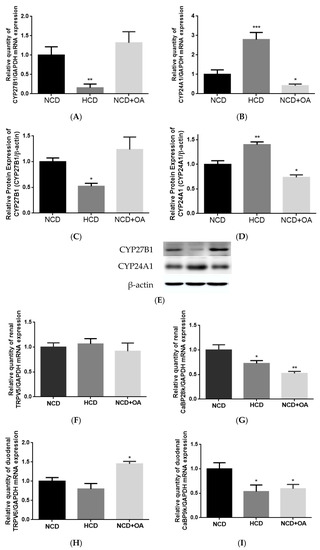 The effect of HCD and OA treatments on renal CYP27B1 and CYP24A1 mRNA and protein expression in aged female rats are shown in Figure 3. As anticipated, HCD suppressed renal CYP27B1 mRNA and protein expressions (vs. NCD, Figure 3A,C,E) and induced renal CYP24A1 mRNA and protein expressions (vs. NCD, Figure 3B,D,E) in aged rats. OA treatment significantly suppressed the mRNA and protein expressions of renal CYP24A1 (vs. NCD, Figure 3B,D,E) but did not alter CYP27B1 expressions in aged rats.