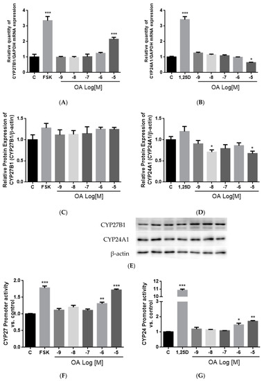 Effects of OA on CYP27B1 and CYP24A1 mRNA, protein expressions, and promoter activities in HKC-8 cells. The expression levels of (A) CYP27B1 mRNA; (B) CYP24A1 mRNA; (C) CYP27B1 protein; (D) CYP24A1 protein as well as the promoter activities of (E) CYP27B1 and (F) CYP24A1 in HKC-8 cells were studied. HKC-8 cells were treated with vehicle (0.1% ethanol), 10−7 M PTH (1–34, human), 10−5 M Foskolin or 10−8 M 1,25(OH)2D3, and 10−9 M–10−5 M OA for 24 h. Cells were harvested by Trizol reagent at indicated time for RT-PCR and real-time PCR analysis (A,B). Relative gene expression was normalized by GAPDH. Total protein was extracted by lysis buffer and separated by SDS-PAGE and immunoblotted with anti-CYP27B1 (C,E), anti-CYP24A1 (D,E) antibody and normalized with β-actin expression. Promoter activities (F,G) were measured by dual luciferase assay and data were normalized against a thymidine kinase (TK) reporter construct. Results are presented as mean ± SEM (n = 3) and analyzed by one-way ANOVA followed by Tukey’s multiple comparison test. * p < 0.05, ** p < 0.01 and *** p < 0.001 vs. the control.