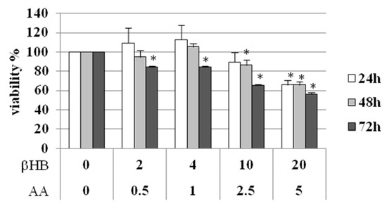 Viability of HMEC-1 treated with KB (βHB 2–20 mM and AA 0.5–5 mM). Data are expressed as mean ± SD. * p < 0.05 compared with control (βHB = 0 and AA = 0).