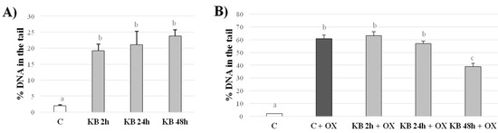DNA damage was evaluated in cells supplemented or not with KB (again for 2, 24 or 48 h), and subsequently subjected to an oxidative insult, represented by H2O2 50 μmol/L for 5 min. The results are presented in Figure 2B. Firstly, there was a net increase in oxidative DNA damage in control cells exposed to H2O2 (C = 2.03 ± 0.21 vs. C + OX = 60.92 ± 2.73, % DNA in the tail, p < 0.001); cells previously treated with KB and exposed to H2O2 showed DNA damage as well. However, as the duration of exposure to KB increased, the DNA damage decreased. In fact, there was a significant decrease, equal to −36% (p < 0.001), in H2O2-induced oxidative DNA damage in the cells treated with KB for 48 h (KB48 + OX = 39 ± 2.42% DNA in the tail) compared to the oxidized control cells (C + OX = 60.92 ± 2.73% DNA in the tail). This result suggests a protective effect of KB, which appears able to activate, within 48 h, a positive response by the cells, which confers them protection against a secondary oxidative insult (in this case due to H2O2).