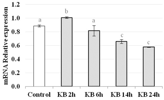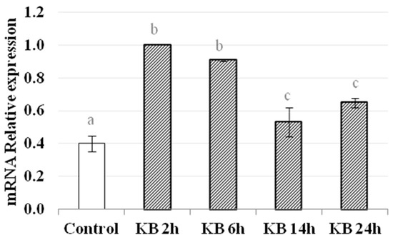 Activation of the Nrf2 pathway was investigated by assessing the gene expression of HO-1. The data show that HO-1 mRNA levels were significantly higher in cells treated with KB compared to control cells, at all time points measured (Figure 5). The greatest increases in mRNA levels occurred after 2 h and 6 h of treatment with KB (C = 0.40 ± 0.05, KB2h = 1.00, KB6h = 0.91± 0.01, p < 0.05), while at later time points there was a decrease, but the values were still higher than in control cells (KB14h = 0.53 ± 0.09, KB24h = 0.65 ± 0.03, p < 0.05).