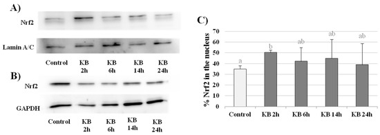 Western blot analysis. Nrf2 protein expression in control cells or cells treated with KB for 2, 6, 14 or 24 h in the nuclear (A) and cytoplasmic (B) fractions. Lamin A/C was used as a nuclear marker. GAPDH was used as a cytoplasmic marker. The western blot image is representative of four independent experiments (A,B). Densitometric analysis of Nrf2 protein expression was performed using lamin A/C as the loading control and Nrf2 nuclear translocation are expressed as the % of Nrf2 in the nuclear fraction compared to the total amount of Nrf2 in whole cells. Data are the mean ± SD of four independent experiments. Data not sharing a common letter are significantly different, p < 0.05 (C).