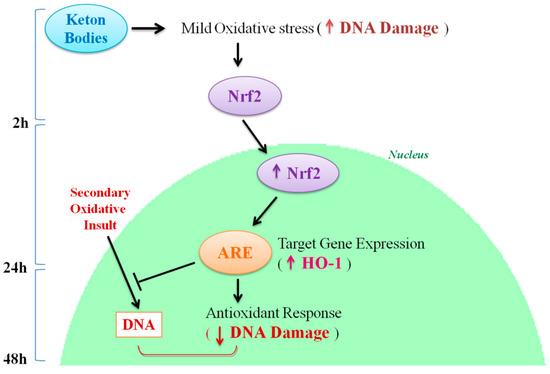 Further studies, planned in order to evaluate the effects of AA and βHB individually supplemented, should clarify their specific influence on DNA oxidative damage and Nrf2 activation. Moreover, it will be interesting to assess the expression of multiple Nrf2 target genes, in addition to HO-1, to further confirm KB activation of Nrf2 pathway.