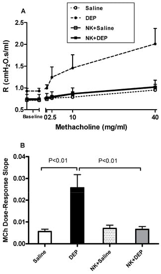 Airway hyper-responsiveness. The airway resistance (R), after increasing concentrations of methacholine (0–40 mg/mL), was measured via the forced oscillation technique (FlexiVent), 24 h after intratracheal instillation of either saline or diesel exhaust particles (DEP, 30 µg/animal), with or without nootkatone (NK) pretreatment. There was a dose–response relationship of total respiratory system resistance to increasing doses of MCh (A). From the resistance MCh dose–response curve in (A), an index of airway responsiveness was calculated as the slope of the linear regression, using 0–40 mg/mL concentrations (B). Data are mean ± SEM (n = 6–8).