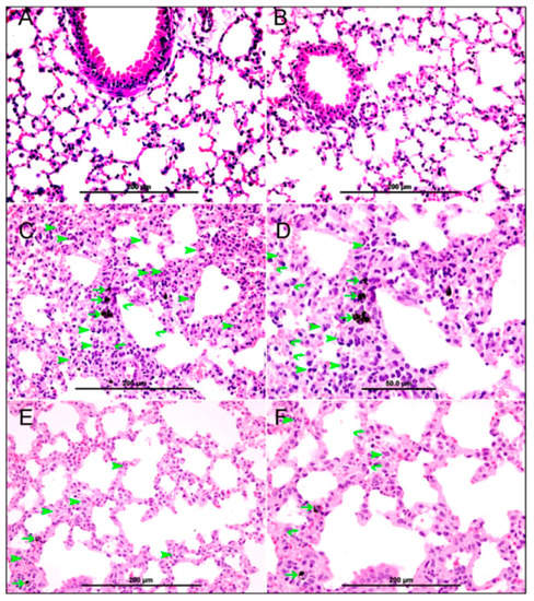 Light microscopy analysis of the lung sections obtained from saline-exposed mice displayed normal structures (Figure 2A). Likewise, lung sections from the nootkatone+saline group showed normal appearances and structures (Figure 2B). The lung sections of mice i.t. instilled with DEP showed particles inside alveolar macrophages which crossed to the alveolar interstitial space (Figure 2C,D). In this group, there was focal damage to the alveolar wall and severe expansion of the alveolar interstitial space, due to heavy neutrophil polymorphs and macrophage infiltration of the interstitium (Figure 2C,D). In the nootkatone+DEP group (Figure 2E,F), histological analysis of the lung showed the presence of DEP within the alveolar macrophages, which crossed to the alveolar interstitial space. There was a marked reduction in the inflammatory infiltrate (neutrophil polymorphs and macrophages) when compared with the DEP-exposed group. Moreover, the interstitial space was also reduced in size when compared with the DEP group.