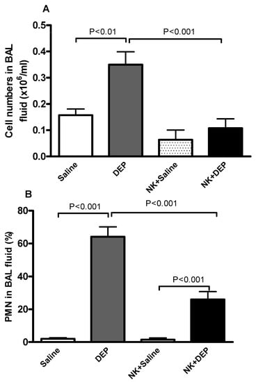 The collection and analysis of BAL was performed, in separate animals, according to a previously described method [,,,]. In brief, mice were sacrificed with an overdose of sodium pentobarbital after either DEP or saline administration, with or without nootkatone treatment. The trachea was cannulated and lungs were lavaged three times with 0.7 mL (a total volume of 2.1 mL) of sterile NaCl 0.9% solution. The recovered fluid aliquots were pooled. No difference in the volume of collected fluid was observed between the different groups. BAL fluid was centrifuged (1000× g 10 min, 4 °C). Cells were counted in a Thoma hemocytometer after resuspension of the pellets and staining with 1% gentian violet. The cell differentials were microscopically performed on cytocentrifuge preparations fixed in methanol and stained with Diff Quick (Dade, Brussels, Belgium).