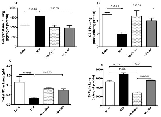 Following the exposure to either DEP or saline, with or without nootkatone pretreatment, individual mice were sacrificed by an overdose of sodium pentobarbital, and their lungs were quickly collected and rinsed with ice-cold PBS (pH 7.4) before homogenization, as described before []. The homogenates were centrifuged for 10 min at 3000× g to remove cellular debris, and the supernatants were used for further analysis []. Protein content was measured by Bradford’s method. Concentrations of 8-isoprostane were determined using an ELISA Kit (Cayman Chemicals, Ann Arbor, MI, USA) []. The concentrations of TNFα were determined using ELISA Kits (Duo Set, R & D Systems, Minneapolis, MN, USA). Measurement of GSH concentrations was carried out according to the method described for the commercially available kit (Sigma-Aldrich Fine Chemicals, Schnelldorf, Germany). The determination of nitric oxide (NO) was performed with a total NO assay kit from R & D Systems (Minneapolis, MN, USA), which measures the more stable NO metabolites: NO2− and NO3− [,].