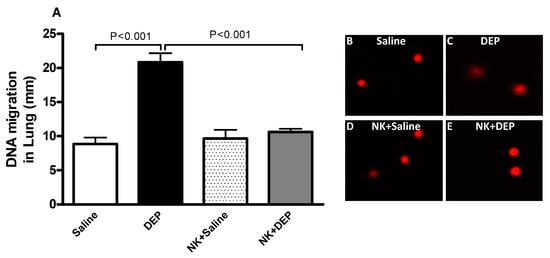 DNA migration (mm) in the lung tissues (A) evaluated by Comet assay, 24 h after intratracheal instillation of either saline or diesel exhaust particles (DEP, 30 µg/animal), with or without nootkatone (NK) pretreatment. Data are mean ± SEM (n = 5 in each group). Representative images, illustrating the quantification of the DNA migration by the Comet assay, under alkaline conditions, in control (B); DEP (C); NK+saline (D) and NK+DEP (E).