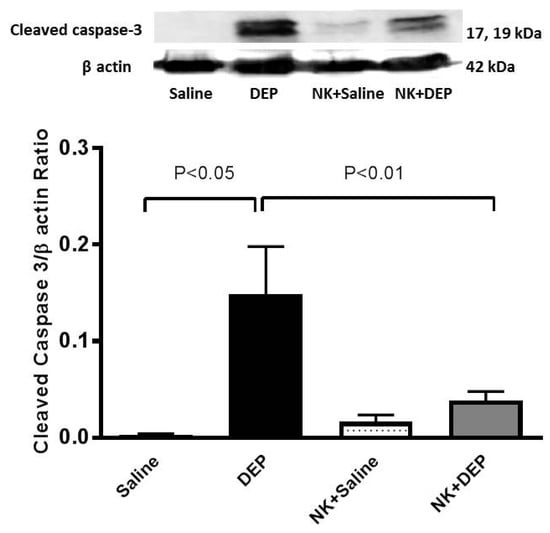 Cleaved caspase-3 levels in the lung tissues determined by Western blotting, 24 h after intratracheal instillation of either saline or diesel exhaust particles (DEP, 30 µg/animal), with or without nootkatone (NK) pretreatment. Data are mean ± SEM (n = 4 in each group).