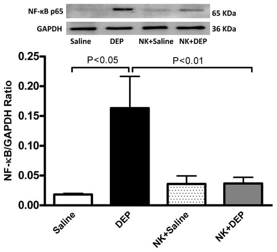 Nuclear factor-kappaB (NF-κB) levels in the lung tissues determined by Western blotting, 24 h after intratracheal instillation of either saline or diesel exhaust particles (DEP, 30 µg/animal), with or without nootkatone (NK) pretreatment. Data are mean ± SEM (n = 4 in each group).