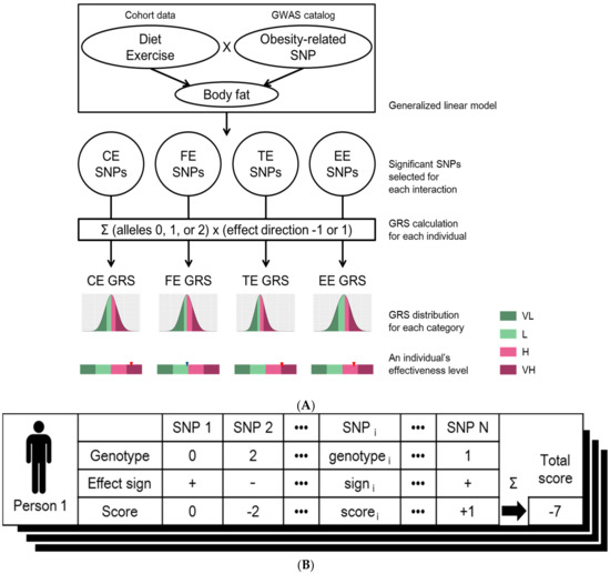 (A) Workflow for designing genome-based personalized health care program. Among the set of SNPs related to obesity under GWAS catalog, SNPs of which has significant interaction effects for diet or exercise were assigned to four different effectiveness categories using generalized linear model: effectiveness of “carbohydrate intake changes” (CE), effectiveness of “fat intake changes” (FE), effectiveness of “total calories intake changes” (TE) or “effectiveness of exercise” (EE). Genetic risk scores (GRS) of four effectiveness categories were calculated per individual. The distributions of GRSs for each of four effectiveness classes were generated using the KoGES cohort. The degree of effectiveness was defined as “very low” (VL; smaller than the 25th percentile GRS), “low” (L; larger than or equal to the 25th percentile and smaller than the 50th percentile GRS), “high” (H; larger than or equal to the 50th percentile and smaller than the 75th percentile GRS), and “very high” (VH; larger than or equal to the 75th percentile GRS) for all of four GRS distributions; (B) Calculation of genetic risk score (GRS). The GRS of an individual is calculated based on the genotypes of the selected SNPs (column names of the table). The score of each SNP (3rd row in the table) was calculated by multiplying the genotype that is the number of risk alleles of each SNPs (1st row in the table) by the effect sign (2nd row in the table) which is determined by the sign of estimated coefficient of the corresponding interaction term from the linear model. These scores are summed over all the selected SNPs to generate the final effectiveness score of the individual (denoted as “Total score” at the right corner of the table). This process was applied to all of the individuals, as well as all of the four categories: “effectiveness of carbohydrate intake changes” (CE), “effectiveness of fat intake changes” (FE), “effectiveness of total calories intake changes” (TE), and “effectiveness of exercise” (EE). Thus, a total of four GRS distributions were generated.