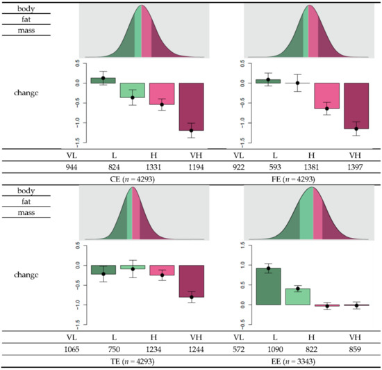Based on the sign of the estimated coefficient, the final set of SNPs was assigned with a value of either −1 or 1 (Table 2). The genetic risk score (GRS) was calculated as the total number of risk alleles of a SNP multiplied by the assigned sign. The GRS data approximately followed a normal distribution. Descriptive statistics of the GRS distribution are summarized in Table 4. The GRS means and standard deviations were 0.43 ± 3.81, 1.4 ± 2.5, 5.4 ± 4.2, and 1.5 ± 3.1 for CE, FE, TE, and EE, respectively. To investigate changes in body fat in relation to the GRS, individuals were stratified into four groups, namely, very low (VL), low (L), high (H), and very high (VH), for each category (Figure 2). Overall, as the effectiveness level increased from VL to VH, body fat reduction tended to be higher according to either reduction in nutrient intake or exercise onset. For example, for individuals with greater than 75 g reduction in carbohydrate intake (first quantile of the distribution of changes in carbohydrate intake), the mean changes in body fat were 0.13, −0.37, −0.54, and −1.19, for the CE-VL, CE-L, CE-H, and CE-VH groups, respectively. For individuals with greater than 13 g reduction in fat intake (first quantile in the distribution of changes in fat intake) the mean changes in body fat were −0.22, −0.095, −0.25, and −0.80 for the groups FE-VL, FE-L, FE-H, and FE-VH, respectively. In individuals with greater than 478 kcal reduction in total calorie intake (first quantile in the distribution of changes in total calorie intake), the mean changes in body fat were 0.093, 0.0055, −0.64, and −1.14 for the groups TE-VL, TE-L, TE-H, and TE-VH, respectively. Among individuals who experienced exercise onset, the corresponding mean changes in body fat were 0.92, 0.41, −0.033, and −0.018. Thus, these results suggest that individuals belonging to the VH group can benefit more from reduced nutrient intake or more rigorous exercise to increase body fat loss compared to individuals classified under lower levels.