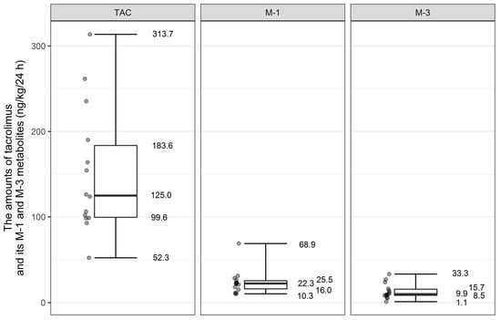 In our group, the mean dose of tacrolimus that would be ingested by the breast-fed infants was 151.4 ng/kg/24 h (SD ± 74.39). The doses of metabolites were 23.80 ng/kg/24 h (SD ± 14.53) for M-1 and 13.25 ng/kg/24 h (SD ± 9.05) for M-3 metabolite (Figure 2).