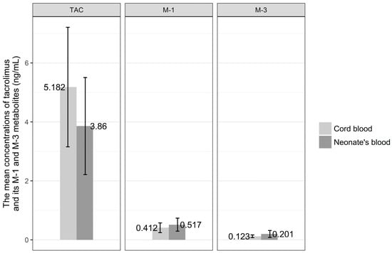 The mean concentration of tacrolimus (TAC) and its M-1 and M-3 metabolites in venous cord blood and in venous blood of the newborns.