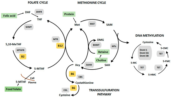 One-carbon metabolism nutrients consumed in the diet are absorbed in the small intestine by active or passive transport mechanisms and are then released into the portal circulation. At the cellular level, folate metabolism occurs in the mitochondria, while the remaining one-carbon metabolism pathways occur in the cytosol. Single nucleotide variants or polymorphisms in specific genes can alter the efficiency of biochemical pathways in one carbon metabolism. For example, polymorphism C677T locus (cytosine (C) is replaced by thymine (T)_at base position 677) in the methylenetetrahydrofolate reductase (MTHFR) gene impairs folate and homocysteine metabolism and DNA methylation capacity, as well as altering disease risk [15]. Therefore, the nutrient requirements for one-carbon metabolism may vary according to specific genotypes.