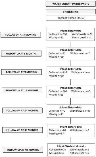 Montrose et al. [70] reported that folate and choline dietary intake was associated with higher buccal long interspersed nuclear elements-1 (LINE-1) DNA methylation in asthmatic children aged 8 to 17 years, however these study findings may not be applicable to healthy children. In a large (n = 568) study conducted in a middle-income country, the association between micronutrient status biomarkers and LINE-1 DNA methylation in white blood cells was analysed [71]. This study did not find an association between erythrocyte folate and plasma vitamin B12 and LINE-1 methylation in children aged 5–12 years [71]. Therefore, due to the limited evidence and small samples, the association between postnatal nutrition and child DNA methylation remains to be determined and requires further characterisation. In addition, evidence from studies conducted in adults, suggest that gene variants, such as C677T MTHFR polymorphism, alter folate metabolism and diminish global DNA methylation levels [15,72]. The association between polymorphisms and global DNA methylation could be analysed in the WATCH cohort and would require further genotyping.