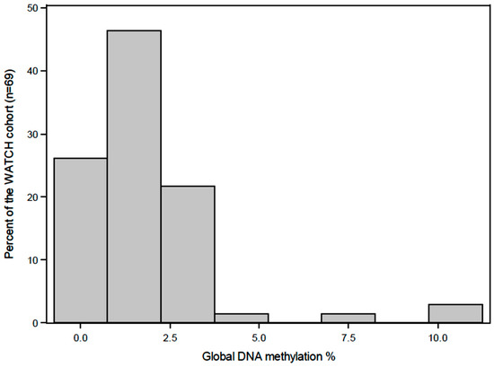 Frequency histograms for the range of global DNA methylation percentage versus percentage of the sample population for the WATCH children.