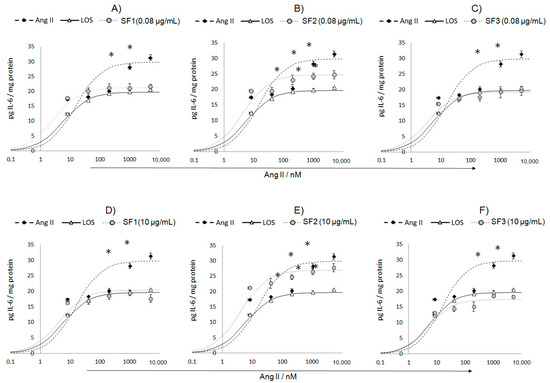 Concentration–response curves of the subfractions evaluated on Ang II (angiotensin II)-induced IL-6 (Interleukin 6) production, 12 h after treatment. (A–C) Effect of 0.08 μg/mL of SF1 (subfraction 1), SF2, and SF3; (D–F) Effect of 10 μg/mL of SF1, SF2, and SF3. Human microvascular endothelial cells-1 (HMEC-1) cells were co-cultured with the concentrations of Ang II specified above. Losartan (LOS) was used as a positive control. Data are reported as mean ± SD (standard deviation) and were analyzed by ANOVA and the post-hoc Tukey test. n = 5, * p < 0.05 vs. control (Ang II-free).