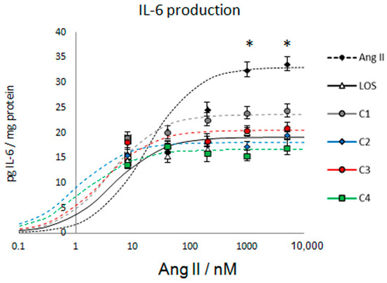 Concentration–response curves of the assessed combinations on Ang II-induced IL-6 production, 12 h after treatment. Losartan (LOS) was used as a positive control. C1 = 0.08 μg/mL of SF1 and 0.08 μg/mL of SF3; C2 = 0.08 μg/mL of SF1 and 10 μg/mL of SF3; C3 = 10 μg/mL of SF1 and 0.08 μg/mL of SF3; C4 = 10 μg/mL of SF1 and 10 μg/mL of SF3. Data are reported as mean ± SD and were analyzed by ANOVA and the post-hoc Tukey test. n = 5, * p < 0.05 vs. control (Ang II-free).