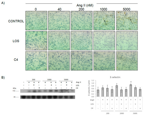 Along with cytokine production, a well-known proinflammatory parameter induced by Ang II is the expression of adhesion molecules. Thus, the capacity of C4 to prevent the expression of E-selectin (Figure 3) and ICAM-1 (Supplementary Figure S1) was evaluated. Our results indicate that HMEC-1 cells expressed both adhesion molecules in the presence of Ang II 1000 and 5000 nM. This expression was diminished by C4, even at the highest Ang II concentration tested. Similar results were obtained with losartan.