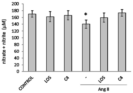 The decrease in NO bioavailability is a key marker of oxidative stress induced by Ang II. Thus, we assessed the capacity of C4 to prevent a reduction in NO availability by the Griess reaction. As shown in Figure 4, Ang II caused a small but significant reduction in NO bioavailability; this effect was abolished by C4, maintaining this parameter at levels similar to Ang II-free and losartan controls.