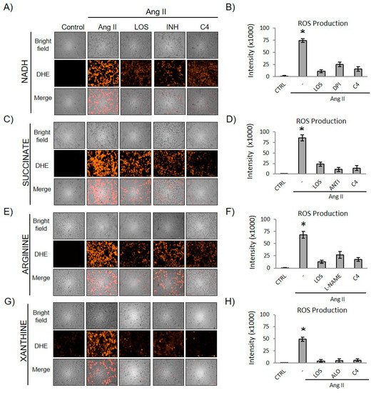 Effect of C4 on the production of O2∙− from four different reactive oxygen species (ROS) sources, NADH (A,B), Succinate (C,D), Arginine (E,F) and Xanthine (G,H). HMEC-1 cells were stimulated with Ang II 5000 nM for 6 h. Representative microphotographs were taken with a 20× objective (A,C,E,G). Data are reported as mean ± SD and were analyzed by ANOVA and the post-hoc Tukey test. n = 5, * p < 0.05 vs. control (Ang II-free), (B,D,G,H). LOS: Losartan; INH: Respective inhibitor; C4: Combination of SF1 and SF3, 10 μg/mL each; DHE: Dihydroethidium; ROS: reactive oxygen species; ALO: allopurinol; CTRL: Control; DPI: Diphenyleneiodonium; NADH: nicotinamide adenine dinucleotide phosphate; ANTI: antimycin; l-NAME: N(ω)-nitro-l-arginine methyl ester.