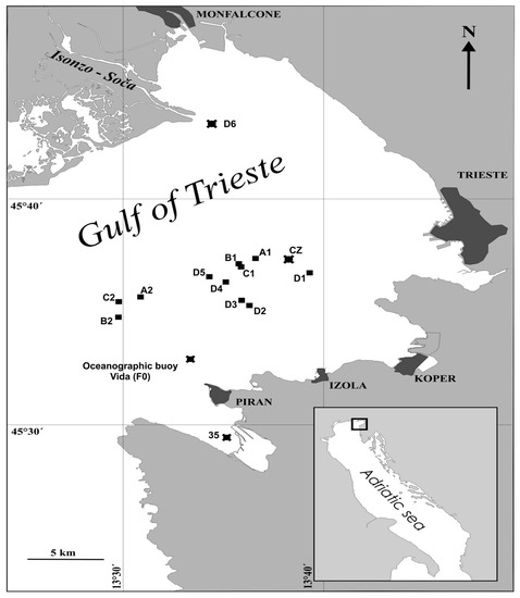 - Ogorelec, B.; Mišič, M.; Faganeli, J. Marine geology of the Gulf of Trieste (Northern Adriatic): Sedimentological aspects. Mar. Geol. 1991, 99, 79–92. [Google Scholar] [CrossRef]