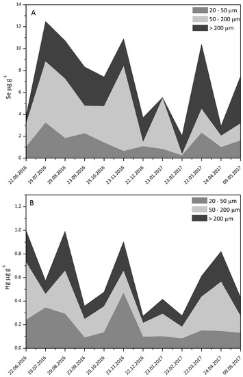 At F0, the levels of Hg (Table 2) in the 20–50 µm microplankton fraction are between 8–541 ng/g dw, between 211–422 ng/g dw in the 50–200 µm fraction and between 11 and 342 ng/g dw in the >200 µm mesoplankton fraction. These levels are comparable to those previously reported for the Gulf of Trieste [].
